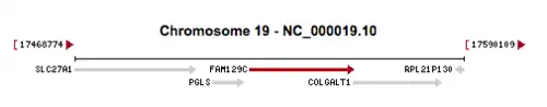 The FAM129C gene is 30,538 base pairs long and is mapped to 19p.13.112 on chromosome 19 (NC_000019.10) from 17523301 to 17553839 in humans. Chromosome 19 has highest gene density of all human chromosomes[5] and large clustered gene families corresponding to high G + C content, CpG islands, and high-density repetitive DNA suggest evolutionary significance for genes located here.[5] Based on location and expression of FAM129C gene, this would suggest it has a role in immune system function.