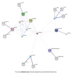 FAM149A has potential interactions with ZNF385D, C10orf10, PNMAL1, CPN2, C10orf72, VPS13D, and RBMS3.[18] Based on previous research on binding sites, many were frequently involved with zinc finger proteins. According to the results from STRING, the second strongest associating protein is zinc finger protein 385D. However, it cannot be concluded these are the only interacting proteins, as it seems there is little to not research involving FAM149A interactions. The Molecular Interaction Database (MINT) was used as an additional source for protein interactions. However, FAM149A was not in the database. Based on the list of functional partners by STRING, the top 5 are also not in the MINT database. Another interaction database, I2D Protein-Protein Interaction[19] showed possible interaction with the Protein PRKAG1, however interaction was weak.