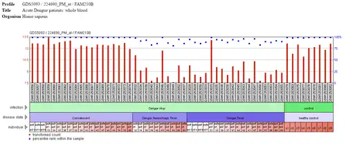 The following image contains the gene expression of FAM210B in patients with dengue fever or those who are convalescent. As seen by the blue dots, there is decreased rank of FAM210B in patients experiencing hemorrhagic fever and fever as compared to the healthy controls.[17]