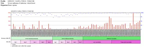 The following image contains the gene expression of FAM210B in patients with severe bacterial pneumonia, severe influenza, and those who received the influenza vaccine. As seen in the image, FAM210B is lower in rank in the patients with severe bacterial pneumonia and are even lower in those with severe influenza, as compared to those who received the influenza vaccine.[18]