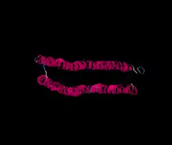 The majority of the structure is composed of alpha helices. As predicted my Phyre 2, 61% of the protein forms alpha helices, and 28% forms transmembrane segments. A detailed map of the transmembrane topology is shown below.[8]