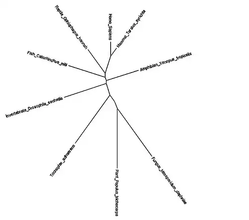 The size of the gene family is two, and includes FAM210A and FAM210B. Gene duplication seems to have occurred when plants diverged from protists. The most distant ortholog found was Populus trichocarpa, also known as the black cottonwood tree.[12] The unrooted phylogenetic tree below demonstrates this divergence.[13] All of the organisms in the tree can also be found in the ortholog table above.