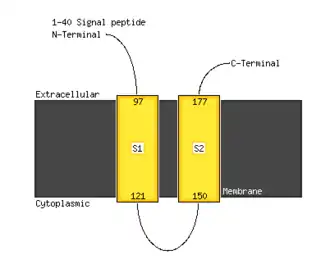 There is 1 positive charge run of 4 residues at position 79, EEKK. A high scoring transmembrane sequence is present at positions 99–123, VGVSLHIGISLISLGIFYM VVSSGV. An endoplasmic reticulum retention signal (PAAK) is present at positions 187–191.[7]