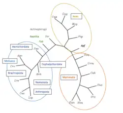 FAM43A and paralog FAM43B comprise a specific gene family, and share structural homology with the low-density lipoprotein receptor adaptor protein (LDLrP).[14][15] Orthologs were identified in Mammalia, Aves, Actinopterygii, Reptilia, Hemichordata, Cephalochardata, Mollusca, Brachiopoda, Nematoda, and Arthropoda. No orthologs were identified beyond invertebrate species.[16]