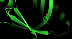 FAM43 is predicted to be a nuclear protein, to identify function, structure and function for LDL receptor adaptor protein (LDLrP) was completed.[30] Conserved residues Y52 and S93 are highlighted in the structure of LDLrP to the right. Three phosphorylation sites were identified with conservation between human and mouse genotypes[31] at T112-p, S114-p, and T-379-p. The translated protein contains a primary and secondary nuclear localization signal and has a predicted GPI-linkage site at D407,[32] and a Caspase 3 and 7 cleavage site from amino acids 404-408[33] indicating possible translocation from the cell membrane to the nucleus.
