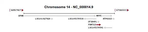 In humans, FAM71D is located at 14q23.3 and stretches between positions 67189393 and 67228550 (span 39157 bp).[7] It codes for at least 10 unique human protein isoforms: the primary isoform (422 aa; also denoted X1),[8][9][10][11] isoform X2 (417 aa),[12] isoform X3 (413 aa),[13] isoform X4 (400 aa),[14] isoform X5 (399 aa),[15] isoform X6 (398 aa),[16] isoform X7 (392 aa),[17][18] isoform X8 (389 aa),[19] isoform X9 (347 aa),[20] isoform X10 (336 aa)[21] In humans, FAM71D codes for an mRNA strand that is 1790 base pairs long. The human mRNA is composed of a 5' untranslated region that is 290 bases long and a 3' untranslated region that is 231 bases long[22] The gene has the following neighbours on the same chromosome: