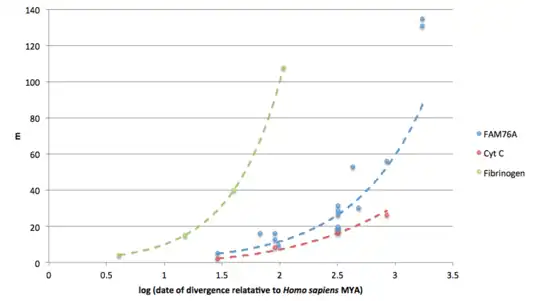 FAM76A appears to have a moderate rate of mutation when compared to fibrinogen (fast mutating) and cytochrome c (slow mutating).[7][27] This suggests that FAM76A has been at least somewhat resistant to mutation during the course of evolution.