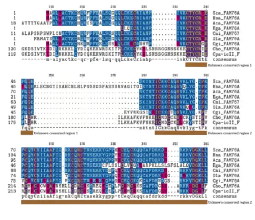 The amino acid composition of FAM76A protein showed amino acid frequencies within 1.5% of that of normal human proteins for all but cysteine, valine, and lysine. Cysteine and lysine have higher frequencies compared to a normal Homo sapiens protein, while valine has a lower frequency compared to a normal Homo sapiens protein. These same amino acid frequency differences are seen in FAM76A orthologs such as Gallus gallus (H. sapiens sequence identity 84%), Serinus canaria (H. sapiens sequence identity 77%), and Crassostrea gigas (H. sapiens sequence identity 57%).
