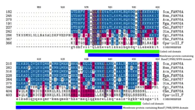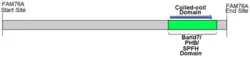 FAM76A is a protein that in Homo sapiens is encoded by the FAM76A gene.[5] Notable structural characteristics of FAM76A include an 83 amino acid coiled coil domain as well as a four amino acid poly-serine compositional bias.[6] FAM76A is conserved in most chordates but it is not found in other deuterostrome phlya such as echinodermata, hemichordata, or xenacoelomorpha—suggesting that FAM76A arose sometime after chordates in the evolutionary lineage. Furthermore, FAM76A is not found in fungi, plants, archaea, or bacteria.[7] FAM76A is predicted to localize to the nucleus and may play a role in regulating transcription.[8]