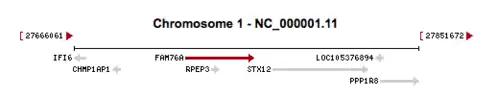 Genes that flank FAM76A on the telomeric side include IFI6, CHMP1AP1, and RPEP3, while genes that flank FAM76A on the centromeric side include STX12, PPP1R8, and L0C105376894.[5]