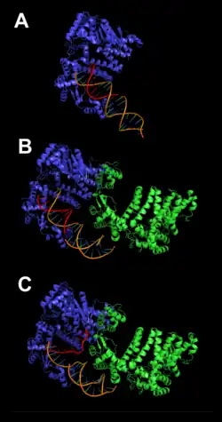 FAN1 is a protein of 1017 amino acids.[7] Several crystal structures of the residues 373-1017 have been characterized. This portion of FAN1 contains three domains: an SAP domain (primary-DNA binding domain), a TPR domain (mediating interdomain interaction and dimerization interface) and the virus-type replication-repair nuclease module (VRR_NUC, catalytic site) (Figure 1).[8] DNA binding promotes dimerization of FAN1 in a "head to tail" fashion.[6]