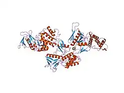 In molecular biology, the FERM domain (F for 4.1 protein, E for ezrin, R for radixin and M for moesin) is a widespread protein module involved in localising proteins to the plasma membrane.[1] FERM domains are found in a number of cytoskeletal-associated proteins that associate with various proteins at the interface between the plasma membrane and the cytoskeleton. The FERM domain is located at the N terminus in the majority of proteins in which it is found.[1][2]