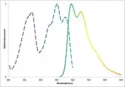 Typically FbFPs have an excitation maximum at a wavelength of approximately 450 nm (blue light) and a second distinct excitation peak around 370 nm (UV-A light). The main emission peak is at approx. 495 nm, with a shoulder around 520 nm. One variant of Pp2FbFP (Q116V) exhibits a 10 nm blue shift in both the excitation and emission spectra.[8] Rationally designed variants of iLOV and CagFbFP exhibit 6 and 7 nm red shifts, respectively. [9]