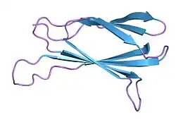 The Fibronectin type III domain is an evolutionarily conserved protein domain that is widely found in animal proteins. The fibronectin protein in which this domain was first identified contains 16 copies of this domain. The domain is about 100 amino acids long and possesses a beta sandwich structure. Of the three fibronectin-type domains, type III is the only one without disulfide bonding present. Fibronectin domains are found in a wide variety of extracellular proteins. They are widely distributed in animal species, but also found sporadically in yeast, plant and bacterial proteins.