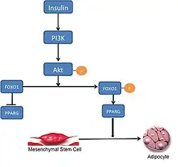 FOXO1 negatively regulates adipogenesis.[9] Presently, the exact mechanism by which this is accomplished is not entirely understood. In the currently accepted model, FOXO1 negatively regulates adipogenesis by binding to the promoter sites of PPARG and preventing its transcription. Rising levels of PPARG are required to initiate adipogenesis; by preventing its transcription, FOXO1 is preventing the onset of adipogenesis. During stimulation by insulin, FOXO1 is excluded from the nucleus and is subsequently unable to prevent transcription of PPARG and inhibit adipogenesis.[10] However, there is substantial evidence to suggest that there are other factors that mediate the interaction between FOXO1 and the PPARG promoter, and that inhibition of adipogenesis is not entirely dependent on FOXO1 preventing transcription of PPARG.[11] The failure to commit to adipogenesis is primarily due to active FOXO1 arresting the cell in G0/G1 through activation of yet unknown downstream targets, with a putative target being SOD2.[12]