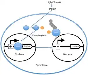 When the level of blood glucose is high, the pancreas releases insulin into the bloodstream. Insulin then causes the activation of PI3K, which subsequently phosphorylates Akt. Akt then phosphorylates FOXO1, causing nuclear exclusion.[18][19] This phosphorylated FOXO1 is then ubiquitinated and degraded by the proteosome.[20] The phosphorylation of FOXO1 is irreversible; this prolongs insulin's inhibitory effect on glucose metabolism and hepatic glucose production. Transcription of glucose 6-phosphatase subsequently decreases, which consequently decreases the rates of gluconeogenesis and glycogenolysis.[21] FOXO1 also activates transcription of phosphoenolpyruvate carboxykinase, which is required for gluconeogenesis.[22] The activity of FOXO1 is also regulated through CBP induced acetylation[23] on Lys-242, Lys-245, and Lys-262. These lysine residues are located within the DNA-binding domain; acetylation inhibits the ability of FOXO1 to interact with the glucose-6 phosphatase promoter by decreasing the stability of the FOXO1-DNA complex. Additionally, this acetylation increases the rate of phosphorylation on Ser-253 by Akt. Mutating Ser-253 to Ala-253 makes FOXO1 constitutively active. SIRT1 reverses this acetylation process; however, the exact mechanism by which SIRT1 deacetylates FOXO1 is still under investigation; presently, acetylation is thought to mitigate the transcriptional activity of FOXO1 and thereby provide an additional level of metabolic regulation that is independent of the insulin/PI3K pathway.[24]