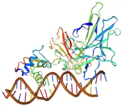 In 2001, the team identified in CS that the mutation is in the middle of a protein-coding gene.[7] Using a combination of bioinformatics and RNA analyses, they discovered that the gene codes for a novel protein belonging to the forkhead-box (FOX) group of transcription factors. As such, it was assigned with the official name of FOXP2. When the researchers sequenced the FOXP2 gene in the KE family, they found a heterozygous point mutation shared by all the affected individuals, but not in unaffected members of the family and other people.[7] This mutation is due to an amino-acid substitution that inhibits the DNA-binding domain of the FOXP2 protein.[72] Further screening of the gene identified multiple additional cases of FOXP2 disruption, including different point mutations[8] and chromosomal rearrangements,[73] providing evidence that damage to one copy of this gene is sufficient to derail speech and language development.