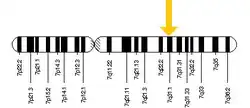 In 1998, Oxford University geneticists Simon Fisher, Anthony Monaco, Cecilia S. L. Lai, Jane A. Hurst, and Faraneh Vargha-Khadem identified an autosomal dominant monogenic inheritance that is localized on a small region of chromosome 7 from DNA samples taken from the affected and unaffected members.[5] The chromosomal region (locus) contained 70 genes.[71] The locus was given the official name "SPCH1" (for speech-and-language-disorder-1) by the Human Genome Nomenclature committee. Mapping and sequencing of the chromosomal region was performed with the aid of bacterial artificial chromosome clones.[6] Around this time, the researchers identified an individual who was unrelated to the KE family but had a similar type of speech and language disorder. In this case, the child, known as CS, carried a chromosomal rearrangement (a translocation) in which part of chromosome 7 had become exchanged with part of chromosome 5. The site of breakage of chromosome 7 was located within the SPCH1 region.[6]