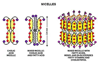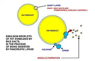 These triglycerides cannot be absorbed by the intestine.[27] They are broken down into mono- and di-glycerides plus free fatty acids (but no free glycerol) by pancreatic lipase, which forms a 1:1 complex with a protein called colipase (also a constituent of pancreatic juice), which is necessary for its activity. The activated complex can work only at a water-fat interface. Therefore, it is essential that fats are first emulsified by bile salts for optimal activity of these enzymes.[28] The digestion products consisting of a mixture of tri-, di- and monoglycerides and free fatty acids, which, together with the other fat soluble contents of the diet (e.g. the fat soluble vitamins and cholesterol) and bile salts form mixed micelles, in the watery duodenal contents (see diagrams on the right).[27][29]