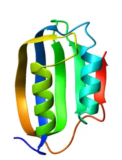 Ribbon diagram of acylphosphatase (PDB accession code 2ACY), which adopts a ferredoxin fold with an extra β-strand at the C-terminus (shown in red). The ribbon is colored from blue (N-terminus) to red (C-terminus).