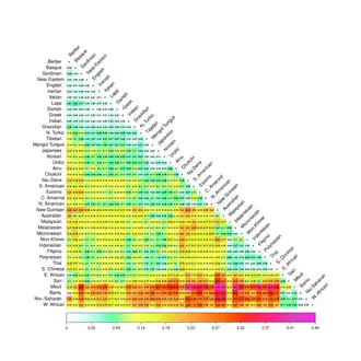 - ↑ Elhaik, Eran (2012). "Empirical Distributions of FST from Large-Scale Human Polymorphism Data". PLOS ONE. 7 (11): e49837. Bibcode:2012PLoSO...749837E. doi:10.1371/journal.pone.0049837. PMC 3504095. PMID 23185452.