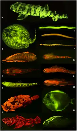 - 1 2 3 4 5 Sparks, J. S.; Schelly, R. C.; Smith, W. L.; Davis, M. P.; Tchernov, D.; Pieribone, V. A.; Gruber, D. F. (2014). Fontaneto, Diego (ed.). "The Covert World of Fish Biofluorescence: A Phylogenetically Widespread and Phenotypically Variable Phenomenon". PLOS ONE. 9 (1): e83259. Bibcode:2014PLoSO...983259S. doi:10.1371/journal.pone.0083259. PMC 3885428. PMID 24421880.
