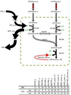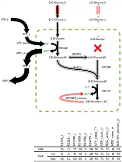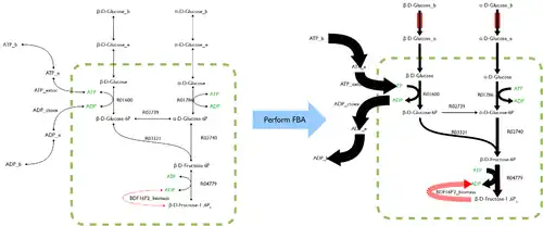 FBA finds applications in bioprocess engineering to systematically identify modifications to the metabolic networks of microbes used in fermentation processes that improve product yields of industrially important chemicals such as ethanol and succinic acid.[5] It has also been used for the identification of putative drug targets in cancer [6] and pathogens,[7] rational design of culture media,[8] and host–pathogen interactions.[9] The results of FBA can be visualized for smaller networks using flux maps similar to the image on the right, which illustrates the steady-state fluxes carried by reactions in glycolysis. The thickness of the arrows is proportional to the flux through the reaction.