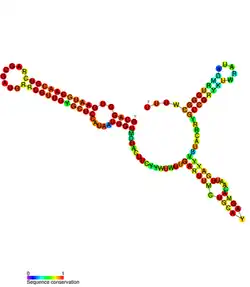 ![]() Conserved secondary structure of FnrS RNA. The colour of nucleotides indicate their conservation within the family. | |