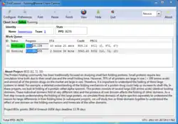 A Folding@home participant installs a client program on their personal computer. The user interacts with the client, which manages the other software components in the background. Through the client, the user may pause the folding process, open an event log, check the work progress, or view personal statistics.[149] The computer clients run continuously in the background at a very low priority, using idle processing power so that normal computer use is unaffected.[133] The maximum CPU use can be adjusted via client settings.[149][150] The client connects to a Folding@home server and retrieves a work unit and may also download the appropriate core for the client's settings, operating system, and the underlying hardware architecture. After processing, the work unit is returned to the Folding@home servers. Computer clients are tailored to uniprocessor and multi-core processor systems, and graphics processing units. The diversity and power of each hardware architecture provides Folding@home with the ability to efficiently complete many types of simulations in a timely manner (in a few weeks or months rather than years), which is of significant scientific value. Together, these clients allow researchers to study biomedical questions formerly considered impractical to tackle computationally.[39][135][137]