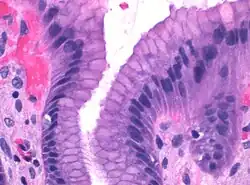 ![]() Microscopic section of gastric mucosa. Foveolar cells can be seen at top of the image lining the surface and pits | |