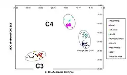 The 13C to 12C ratio in CAM plants can indicate the temporal separation of CO2 fixation, which is the extent of biomass derived from nocturnal CO2 fixation relative to diurnal CO2 fixation.[31] This distinction can be made because PEP carboxylase, the enzyme responsible for net CO2 uptake at night, discriminates 13C less than RuBisCO, which is responsible to daytime CO2 uptake. CAM plants which fix CO2 primarily at night would be predicted to show δ13C values more similar to C4 plants, whereas daytime CO2 fixation would show δ13C values more similar to C3 plants.