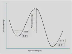 Isotope fractionation due to Rubisco (form I) carboxylation alone is predicted to be a 28‰ depletion, on average.[12][5] However, fractionation values vary between organisms, ranging from an 11‰ depletion observed in coccolithophorid algae to a 29‰ depletion observed in spinach.[13][14] RuBisCO causes a kinetic isotope effect because 12CO2 and 13CO2 compete for the same active site and 13C has an intrinsically lower reaction rate.[15]