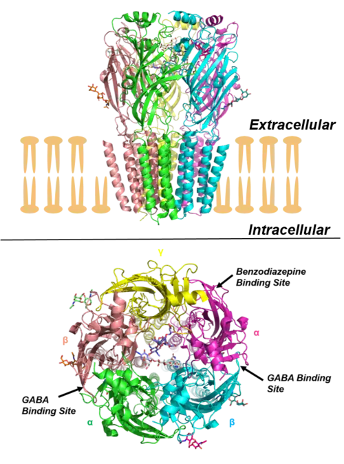 GABAAR are members of the ligand-gated ion channel receptor superfamily, which is a chloride channel family with a dozen or more heterotetrametric subtypes and 19 distinct subunits. These subtypes have distinct brain regional and subcellular localization, age-dependent expression, and the ability to undergo plastic alterations in response to experience, including drug exposure.[4]