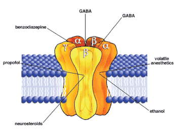 GABAAR is not just the target of agonist depressants and antagonist convulsants, but most GABAAR medicines also act at additional (allosteric) binding sites on GABAAR proteins. Some sedatives and anxiolytics, such as benzodiazepines and related medicines, act on GABAAR subtype-dependent extracellular domain sites. Alcohols and neurosteroids, among other general anesthetics, act at GABAAR subunit-interface transmembrane locations. High anesthetic dosages of ethanol act on GABAAR subtype-dependent transmembrane domain locations. Ethanol acts at GABAAR subtype-dependent extracellular domain locations at low intoxication concentrations. Thus, GABAAR subtypes have pharmacologically distinct receptor binding sites for a diverse range of therapeutically significant neuropharmacological drugs.[4]