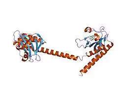 The GAF domain is a type of protein domain that is found in a wide range of proteins from all species.[2] The GAF domain is named after some of the proteins it is found in: cGMP-specific phosphodiesterases, adenylyl cyclases and FhlA. The first structure of a GAF domain solved by Ho and colleagues showed that this domain shared a similar fold with the PAS domain.[3] In mammals, GAF domains are found in five members of the cyclic nucleotide phosphodiesterase superfamily: PDE2, PDE5, and PDE6 which bind cGMP to the GAF domain, PDE10 which binds cAMP, and PDE11 which binds both cGMP and cAMP.[4][5]