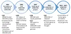 - 1 2 The ENCODE Project Consortium (October 2004). "The ENCODE (ENCyclopedia Of DNA Elements) Project". Science. 306 (5696): 636–40. Bibcode:2004Sci...306..636E. doi:10.1126/science.1105136. PMID 15499007. S2CID 22837649.