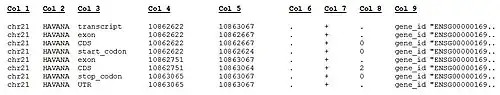 Format description of GENCODE GTF file. TAB-separated standard GTF columns