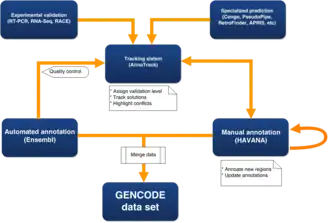 Putative loci can be verified by wet-lab experiments and computational predictions are analysed manually.[15] Currently, to ensure a set of annotation covers the complete genome rather than just the regions that have been manually annotated, a merged data set is created using manual annotations from HAVANA, together with automatic annotations from the Ensembl automatically annotated gene set. This process also adds unique full-length CDS predictions from the Ensembl protein coding set into manually annotated genes, to provide the most complete and up-to-date annotation of the genome possible.[16]