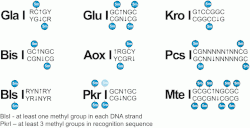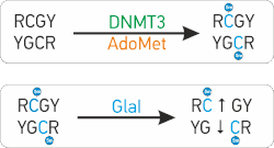 Study of DNMT3a and DNMT3b substrate specificity has shown that both enzymes predominantly recognize RCGY site and modify internal CG-dinucleotide to form 5’-R(5mC)GY-3’/3’-YG(5mC) R-5’ sequence.[4] One of new enzymes GlaI recognizes and cleaves site R(5mC)GY.[5] Due to this unique substrate specificity, GlaI is a convenient tool for identification of de novo methylated sites in the human and mammalian DNA.