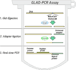 - Subsequent real-time PCR with Taqman probe. Genome primer and TaqMan probe are designed for DNA region of interest, another hybrid primer consist of two parts: one part is complementary to the universal adapter and another one - to the DNA at the point of GlaI hydrolysis.