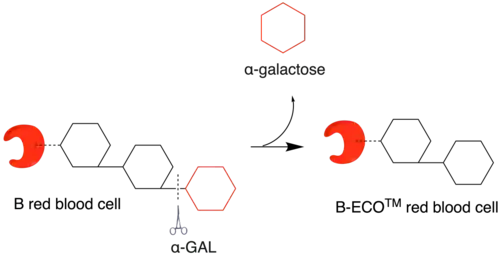 Red blood cell (RBC) surfaces are decorated with the glycoproteins and glycolipids that have the same basic sequence with terminal sugar α1‐2‐linked fucose linked to the penultimate galactose. This galactose molecule is called the H antigen.[28][29][30] Blood type A, B, AB, and O differ only in the sugar (red molecule in the illustration) linked with the penultimate galactose. For blood type B, this linked sugar is an α-1‐3‐linked galactose. Using α-GAL, this terminal galactose molecule can be removed, converting RBC to type O.