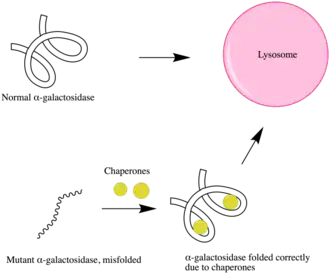 - ↑ Fan JQ, Ishii S, Asano N, Suzuki Y (January 1999). "Accelerated transport and maturation of lysosomal α-galactosidase A in Fabry lymphoblasts by an enzyme inhibitor". Nature Medicine. 5 (1): 112–5. doi:10.1038/4801. PMID 9883849. S2CID 13193351.