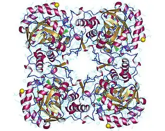 A crystal structure of hGMPR2 was obtained, and the model shows that hGMPR2 is a homotetramer that consist of a mix of alpha helices and beta sheets (parallel and antiparallel). Each monomer interacts with each other at their edges, which allow for stabilization of the tetramer structure. On the surface of each monomer, there are phosphate molecules that exist without any interactions with other subunits. The monomers are listed as monomer A, B, C and D. Monomers A and B consist of 338 residues, one GMP and two sulfate ions. Monomer C is similar, consisting of 327 residues, one GMP molecule and two sulfate ions. Monomer D, however, does not contain a GMP molecule and only consist of 317 residues and two sulfate ions. The alpha helices and beta sheets comes together to form a 8-stranded barrel core, in which it contains several hydrophobic residues that allow the stabilization of the core. The structure also contains disulfide bonds between Cys68 and Cys95, which are not conserved in most GMPRs, but is proposed to be important for stabilizing the entire tetramer structure.[6]