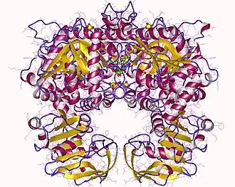 GMP synthase forms a tetramer in an open box shape, which is a dimer of dimers. The R interfaces are held together with a hydrophobic core and a beta sheet, while the P dimer interfaces do not have a hydrophobic core and are more variable than the R interfaces.[1] This enzyme also binds several ligands, including phosphate, pyrophosphate, AMP, citrate and Magnesium.[8]