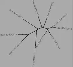 When comparing the rate of evolution of GPATCH11 to known proteins such as fibrinogen and cytochrome c, GPATCH11 is evolving quite rapidly, similar to the rate of the fibrinogen protein. An unrooted evolutionary tree[14] can be seen to the right including representatives of species ranging from invertebrates to mammals. This shows the hypothetical relationship of the GPATCH11 sequence among the different taxa, and is supported by divergence time of the taxa from humans as well as sequence identity/similarity.
