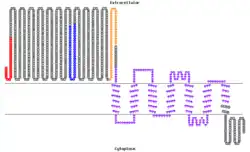 The protein product of GPR113 gene is a G-protein coupled receptor. The protein has three transcript variants in humans.[11] Of these three, GPR113 Variant 1 has the longest amino acid sequence, and has the highest identity to orthologs. This leads to the conclusion that GPR113 Variant 1 is the homo sapiens descendant of the ancestral GPR113 gene. GPR113 Var 1 contains 1079 Amino Acids, and is integral to the plasma membrane.[12] The 7-pass receptor contains 4 domains highlighted in the figure at right: Signal Peptide (Red), Hormone Receptor Domain (Blue), Latrophilin/CL-1-like GPS domain (Orange), and the 7-transmembrane receptor (Purple). Between the Hormone Receptor Domain and the GPS is a Domain of unknown function that is not highlighted.
