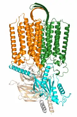 GPR156 (G protein-coupled receptor 156), is a human gene which encodes a G protein-coupled receptor belonging to metabotropic glutamate receptor subfamily.[5] By sequence homology, this gene was proposed as being a possible GABAB receptor subunit, however when expressed in cells alone or with other GABAB subunits, no response to GABAB ligands could be detected. In vitro studies on GPR156 constitutive activity revealed a high level of basal activation and coupling with members of the Gi/Go heterotrimeric G protein family.[6] In 2021, an article was reported that GPR156 modulates hair cell orientation in the cochlea.[7] Also, it was proposed that GPR156 is related to congenital hearing loss.[8] GPR156 in complex with any of the Gi/o heterotrimers regulates the hair cell orientation.[9] In 2024, molecular structures of G-free and Go-bound GPR156 were characterized by using cryogenic electron microscopy.[10]