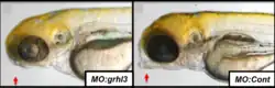 Much the same as the previous two orthologues, Grhl3 is involved in the regulation of epidermal tissue, such as the formation of the jaw, neural tube and other craniofacial features, and does so across both land and aquatic organisms.[23][12][17] Grhl3 is a downstream target of Irf6, and plays a key role in processes involving fusion during development much like Grhl2, especially so in the oral palate and spinal cord.[23] A mutation of Grhl3, that causes an increase or a decrease in expression, can lead to Van der Woude syndrome, which is characterized by phenotypes that include cleft lip and/or palate and spina bifida.[24][25] Primarily, Grhl3 appears to play a vital role for regulating the development of the craniofacial skeleton.[1] A genome-wide association study found that Grhl3 is an etiological variant for a nonsyndromic form of cleft palate, ~50% of all cleft palate cases, highlighting the level of impact that dysregulation of Grhl3 has on development.[26] Apart from the defects that are physically noticeable, Grhl3 is also expressed in the brain of mice embryos and has been shown to regulate the impulsiveness and anxiety levels of mice.[27] Furthermore, it appears that grhl3 regulates the enveloping layer of zebrafish and axial extension as well as cell size and identity during embryonic development.[5] If expression is disrupted during the early stages of disruption it will lead to severe defects that can lead to the death of the embryo before epiboly is complete.[5] Epiboly is the stage of development for select organisms, such as the xenopus, sea urchin and zebrafish, when the cells of the embryo grow and migrate to the opposite end of the yolk sac to envelop it to continue developing.