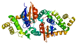 Glutathione S-transferase kappa 1 (GSTK1) is an enzyme that in humans is encoded by the GSTK1 gene which is located on chromosome seven.[5] It belongs to the superfamily of enzymes known as glutathione S-transferase (GST), which are mainly known for cellular detoxification.[6] The GSTK1 gene consists of eight exons and seven introns and although it is a member of the GST family, its structure has been found to be similar to bacterial HCCA (2-hydroxychromene-2-carboxylate) isomerases and bacterial disulphide-bond-forming DsbA oxidoreductase. This similarity has later allowed the enzyme GSTK1 to be renamed to DsbA-L.[7] Research has also suggested that several variations of the GSTK1 gene can be responsible for metabolic diseases and certain types of cancer.[7]
