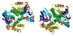 Glutathione S-transferase (GST) theta 1 (GSTT1) is a member of a superfamily of proteins that catalyze the conjugation of reduced glutathione to a variety of electrophilic and hydrophobic compounds. Human GSTs can be divided into five main classes: alpha, mu, pi, theta, and zeta. The theta class includes GSTT1 and GSTT2. The GSTT1 and GSTT2 share 55% amino acid sequence identity and both of them were claimed to have an important role in human carcinogenesis. The GSTT1 gene is located approximately 50kb away from the GSTT2 gene. The GSTT1 and GSTT2 genes have a similar structure, being composed of five exons with identical exon/intron boundaries.[3]